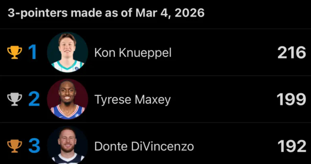 2.此役后本赛季也只有克努佩尔命中超过200个三分球;